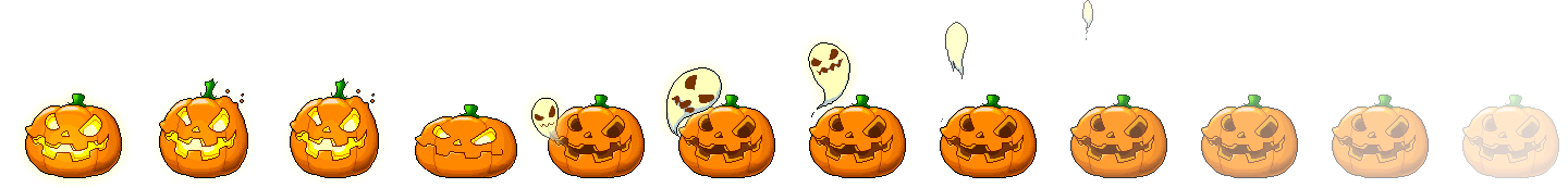 En este segundo ejemplo se puede ver como la calabaza pierde su alma y desaparece. A diferencia del ejemplo anterior el @keyframes se llamará «desaparece» y durará tres segundos. Con la función steps se indica que hay 12 fotogramas y finalmente forwards servirá para que al llegar al final no vuelva la secuencia al primer fotograma. Para que funcione esta sencilla animación se ha definido en el @keyframes el último fotograma en el que se establece la posición final del fondo que será left -1440px. La imagen utilizada tiene un ancho de 1440 pixeles de los que cada fotograma tendrá 120px. Las dimensiones del div han sido definidos en la clase .calabaza. Estableciendo con steps los 12 pasos de la animación el @keyframes divide los 1440px de ancho totales entre 12 consiguiendo el trozo correspondiente a cada paso de 120px. Para que esto resulte es necesario que la imagen tenga todos los trozos perfectamente colocados.