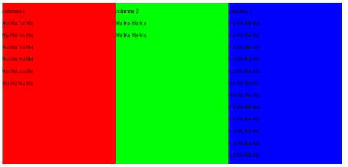 <div id="contenedor"> <div id="columna1"> columna 1 bla bla bla bla ... bla bla bla bla </div> <div id="columna2"> columna 2 bla bla bla bla bla bla bla bla </div> <div id="columna3"> columna 3 bla bla bla bla ... bla bla bla bla </div> </div>