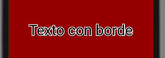 @Override public void onDraw(Canvas canvas){ // Tamaño del texto, calculado según el ancho del canvas float textSize=canvas.getWidth()/10; // Se intancia el pincel Paint pincel=new Paint(); // Se establece el tamaño del texto pincel.setTextSize(textSize); // Centrado pincel.setTextAlign(Paint.Align.CENTER); // El color del borde pincel.setColor(Color.WHITE); // Ancho del trazo pincel.setStrokeWidth(textSize/10); // Se establece el estilo necesario pincel.setStyle(Paint.Style.STROKE); // Fondo canvas.drawARGB(255, 150, 0, 0); // Primera impresión del texto con el pincel con trazo canvas.drawText("Texto con borde", canvas.getWidth() / 2, canvas.getHeight() / 2, pincel); // Se cambia el color del pincel pincel.setColor(Color.BLACK); // Se cambia el estilo para que no lleve trazo pincel.setStyle(Paint.Style.FILL); // Se dibuja el segundo texto canvas.drawText("Texto con borde",canvas.getWidth()/2,canvas.getHeight()/2,pincel); }